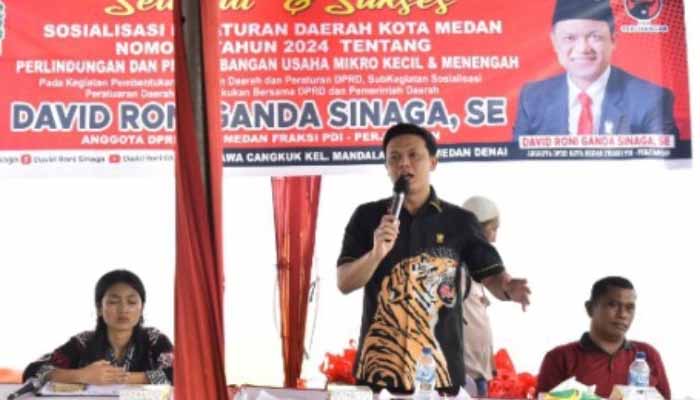 Medan – Anggota DPRD Kota Medan, David Roni G Sinaga melaksanakan kegiatan Sosialisasi Peraturan Daerah (Sosperda) tahap pertama di Jalan Rawa Cangkuk, Kelurahan Tegal Sari Mandala III, Kecamatan Medan Denai, Sabtu (11/10/2025) siang.