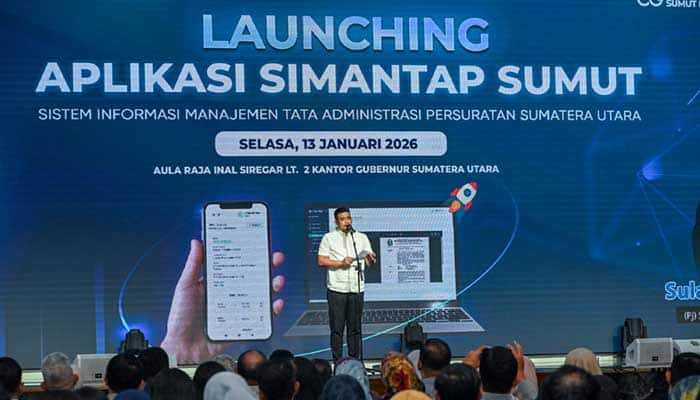 “Sistem ini tujuan utamanya mempercepat dan mempermudah, jangan lari dari konsep ini, mudah-mudahan ini bisa dipenuhi,” kata Bobby saat meluncurkan SIMANTAP SUMUT di Aula Raja Inal Siregar, Kantor Gubernur, Jalan Pangeran Diponegoro Nomor 30, Medan, Selasa (13/1/2026).