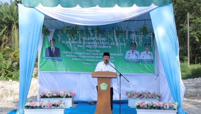 Penyerahan sertifikat tanah hibah dari Bupati Asahan kepada Wakil Menteri Agama RI menjadi penanda resmi dimulainya pembangunan MAN Insan Cendekia Kabupaten Asahan sebagai bagian dari upaya pemerataan akses pendidikan berkualitas di daerah.
