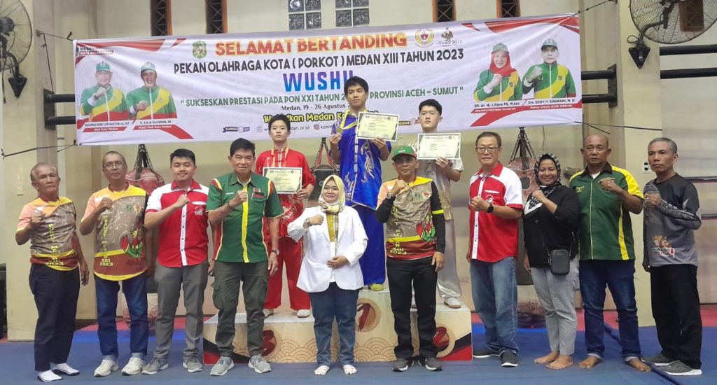 PATROLI NEWS. COM, Medan-Kontingen Medan Kota berhasil tampil sebagai juara umum cabang olahraga (cabor) wushu pada Pekan Olahraga Kota (Porkot) Medan XIII/2023 yang berakhir Senin (21/08/2023) malam, di Padepokan Yayasan Kusuma Wushu Indonesia (YKWI), Jalan Wushu, Medan.
