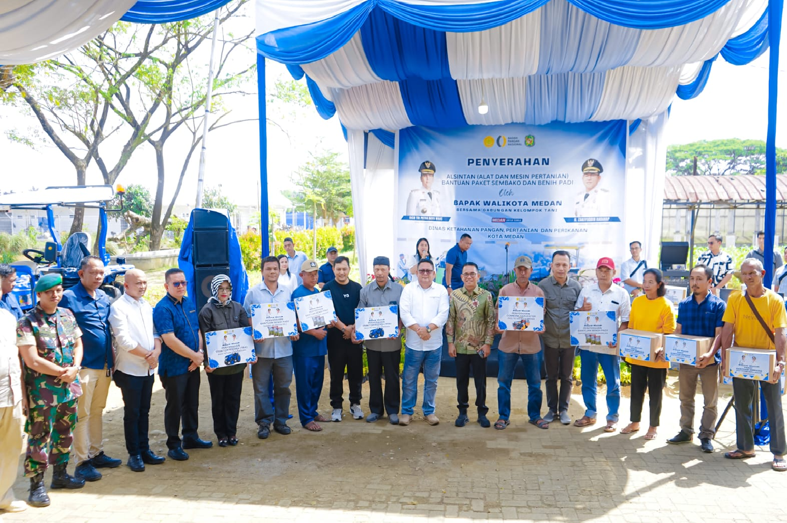 Senyum sumringah terpancar dari wajah para petani di Kota Medan. Harapan mereka untuk meningkatkan produktivitas pertanian kini mulai dapat diwujudkan dengan adanya suntikan semangat baru melalui bantuan alat mesin pertanian (ALSINTAN) berupa 2 unit Traktor Roda 4, dan 1 unit Combine Harvester ditambah bantuan benih padi, dan bantuan paket sembako.